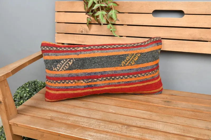 Red & Orange Striped Throw Pillow, 24x12 Handmade Linen Pillow
