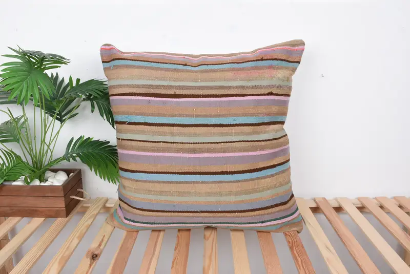 Handwoven Striped Pillow Cover, Pink & Bronze Embroidered Throw Pillow