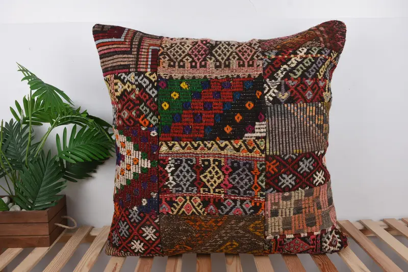 Red & Brown Patchwork Throw Pillow, 32x32 Embroidered Cushion
