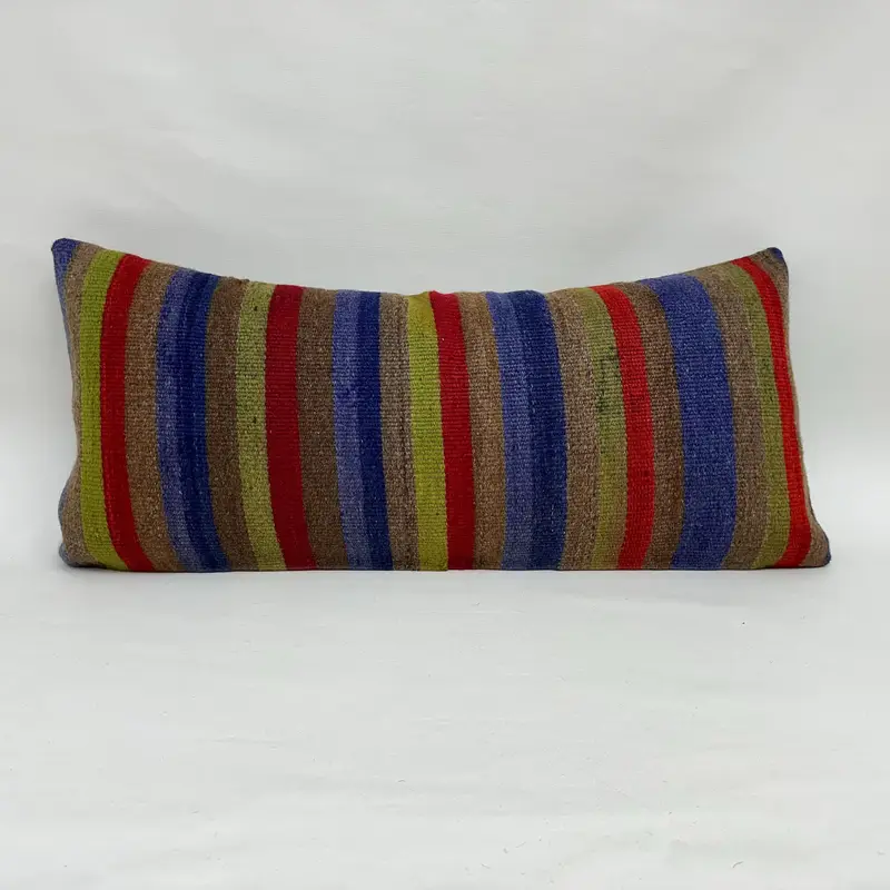 Blue & Green Striped Throw Pillow, 16x36 Embroidered Cushion