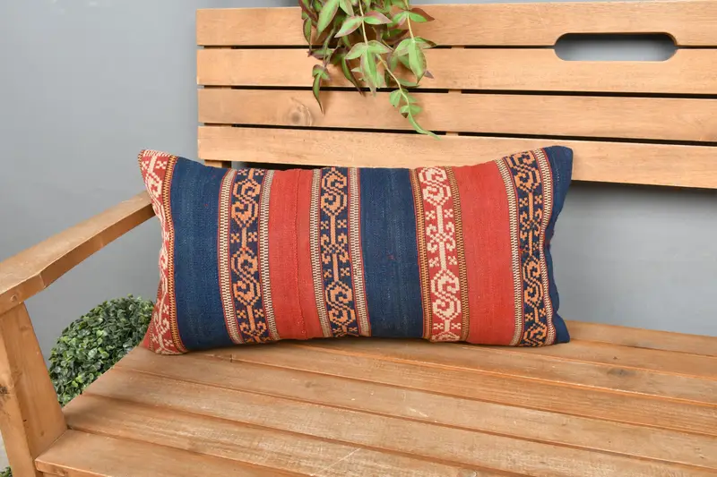 Blue Southwestern Embroidered Pillow, Vintage 12x24 Throw Pillow