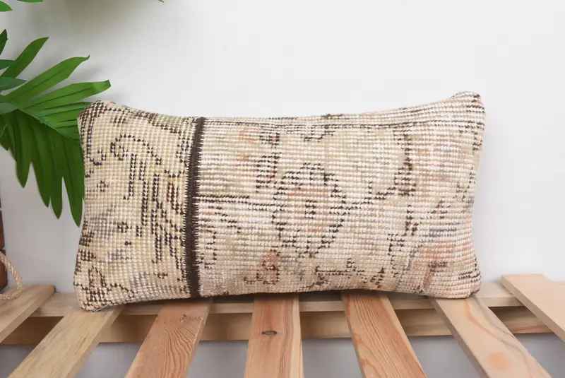 Handmade Beige & Brown Patchwork Throw Pillow, Vintage Rectangle Pillow