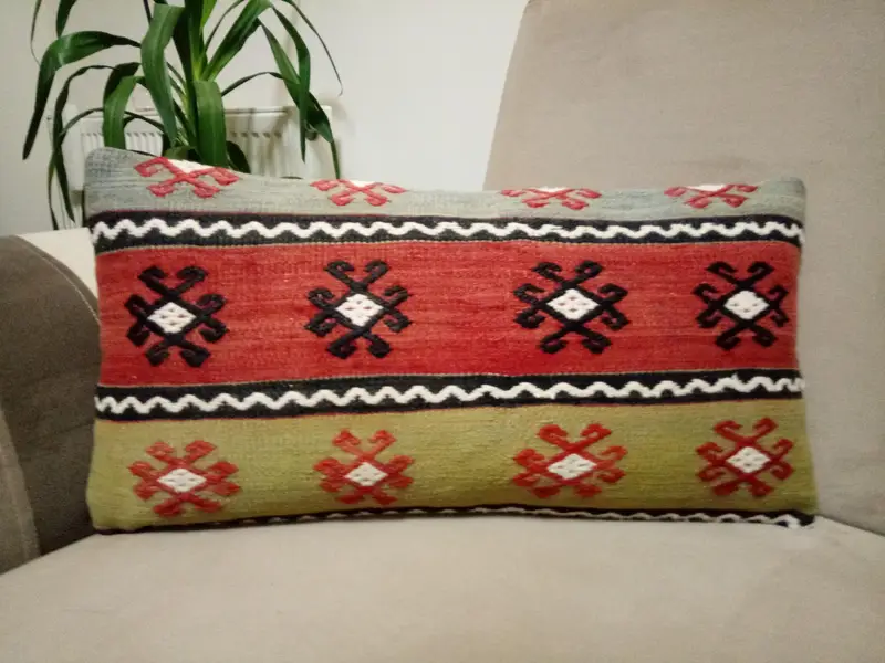 Rectangular Red & Green Striped Throw Pillow, Handmade Wool Pillow