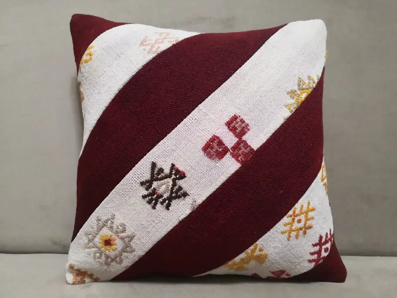 Red and White Patchwork Kilim Throw Pillow, Handmade Wool Cushion