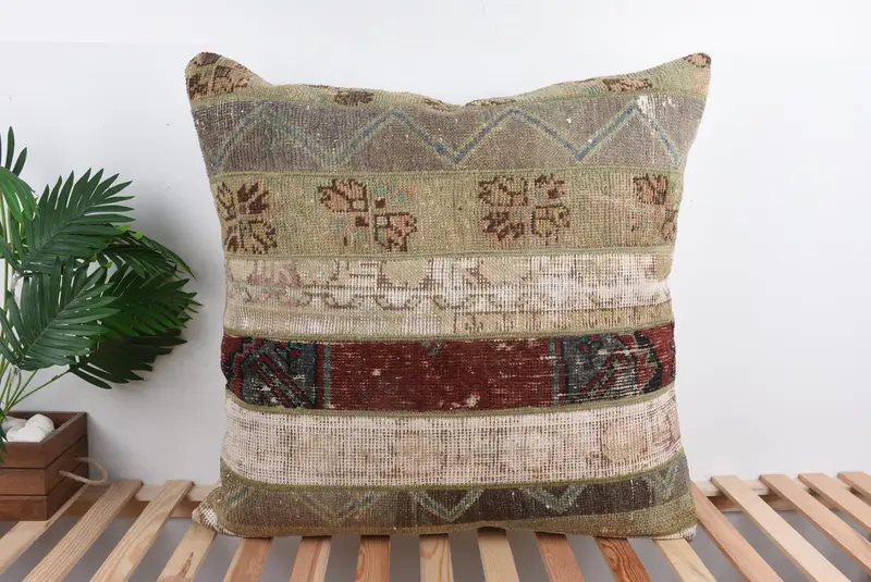 Beige & Brown Embroidered Patchwork Throw Pillow, Vintage Handmade Pillow