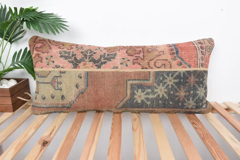 Embroidered Patchwork Pillow, Pink & Brown 16x36 Throw Pillow