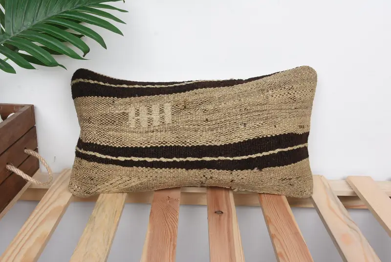 Handmade Beige & Brown Striped Throw Pillow, Vintage Embroidered Cushion