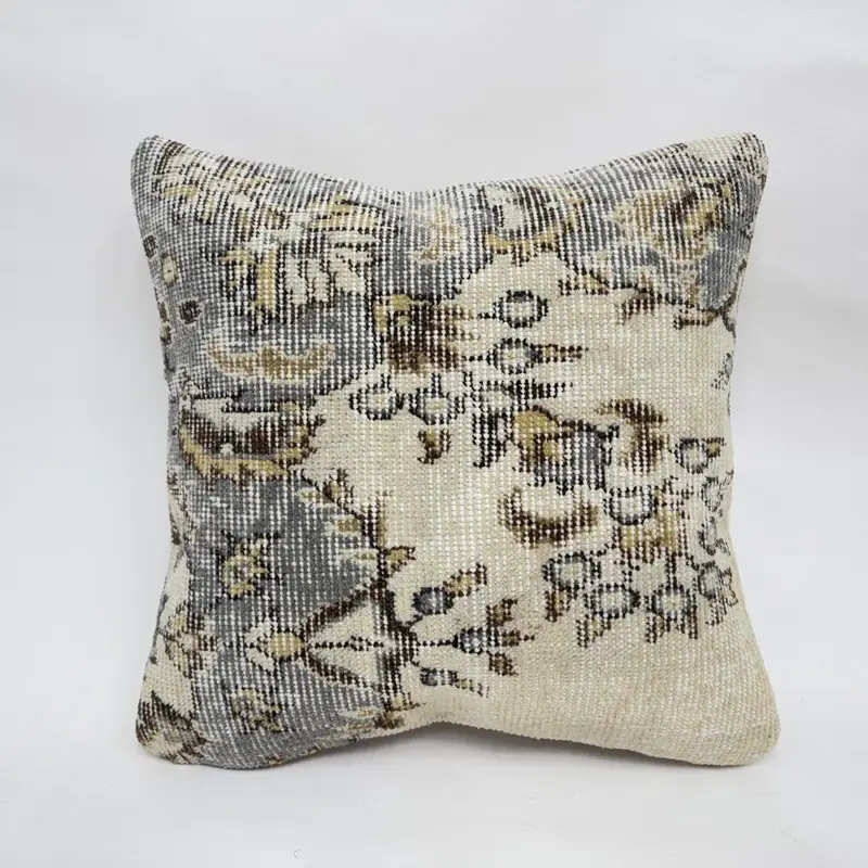 Beige & Gray Embroidered Floral Throw Pillow, Vintage Handmade Cushion