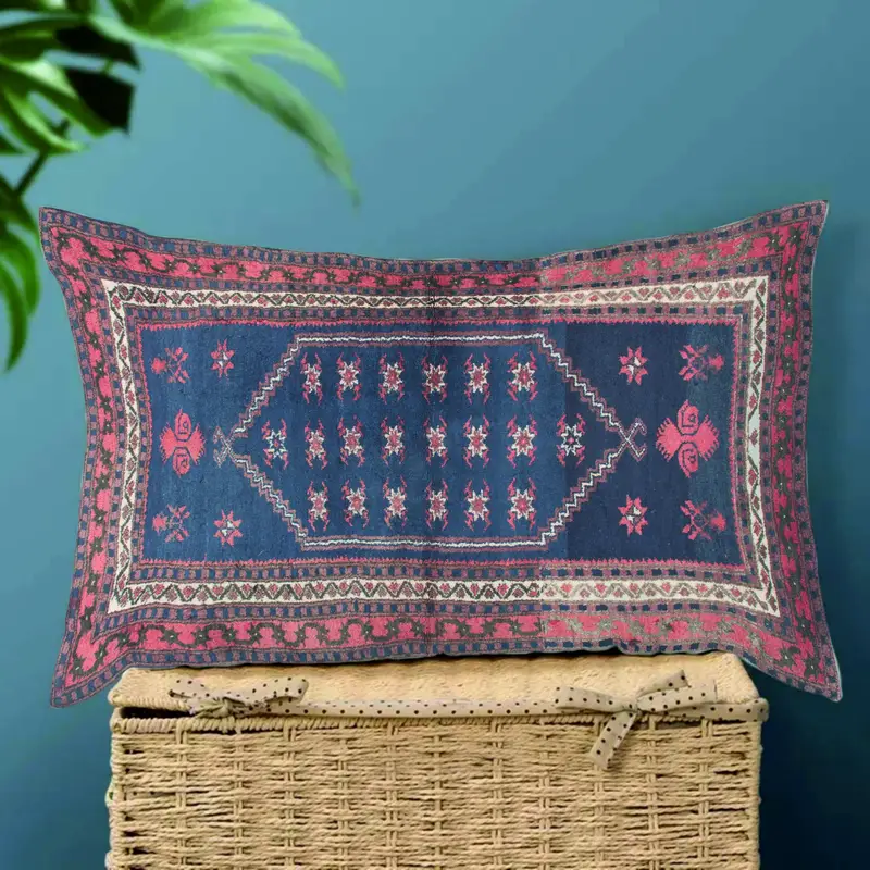 Handmade Southwestern Bolster Throw Pillow, Blue and Beige Linen Cover