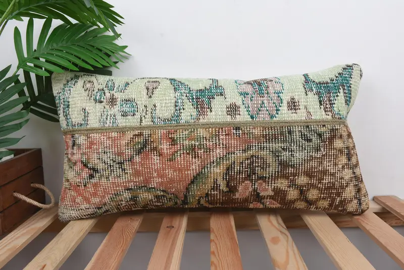 Handmade Beige & Brown Patchwork Throw Pillow, 12x24 Embroidered Vintage Decor
