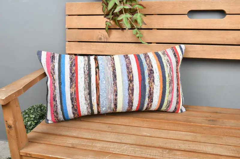 Handcrafted Rectangular Throw Pillow, Vintage Striped Linen Cushion