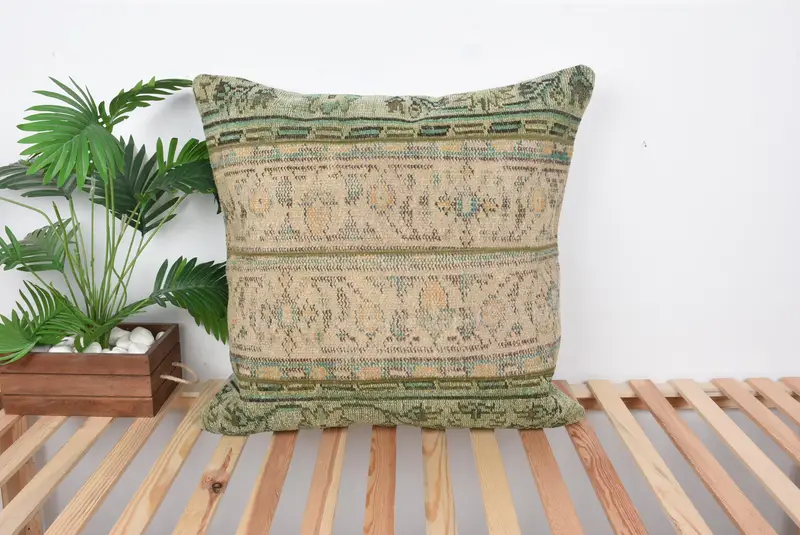 Handmade Green & Orange Patchwork Throw Pillow, Vintage 28x28 Cushion