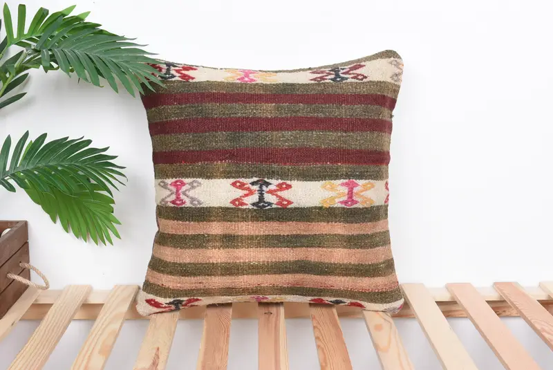 Red and Pink Striped Throw Pillow, Embroidered Vintage Pillow