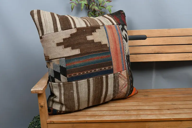 Brown & Bronze Patchwork Throw Pillow, 28x28 Embroidered Vintage Cushion