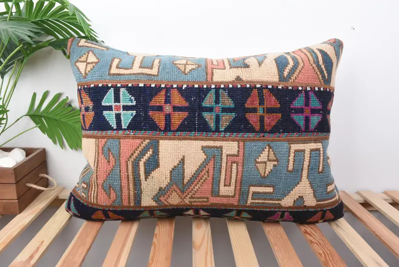 Embroidered Blue & Pink Patchwork Pillow, Handmade 20x28 Throw Pillow