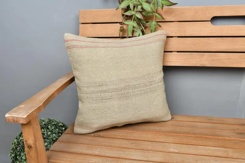 Embroidered Beige & Brown Stripe Throw Pillow, Vintage Cushion