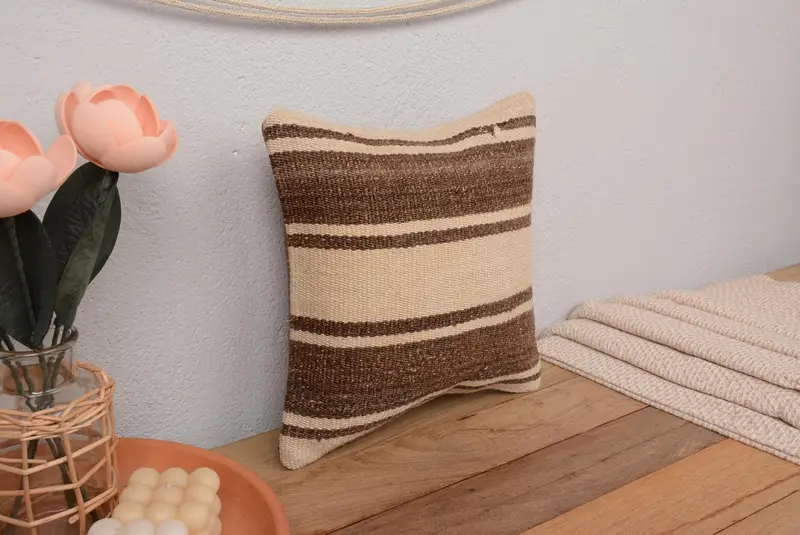 Handmade Striped Throw Pillow, Vintage Brown & Beige Linen Cushion