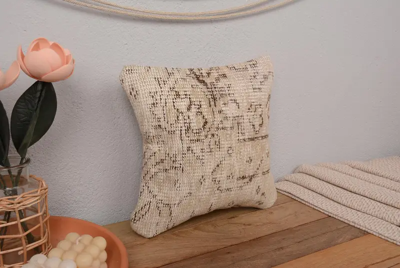 Beige & Brown Floral Embroidered Pillow, 12x12 Handmade Throw Pillow
