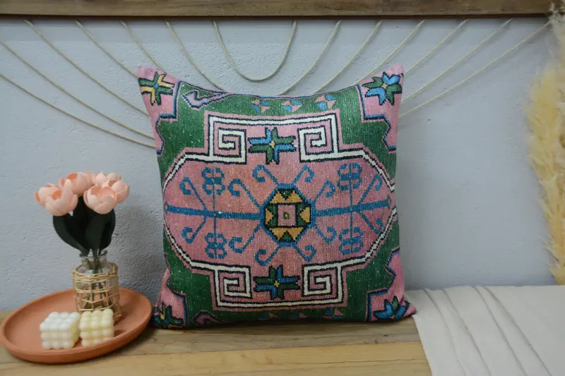 Green & Bronze Embroidered Ikat Throw Pillow, Vintage Square Pillow