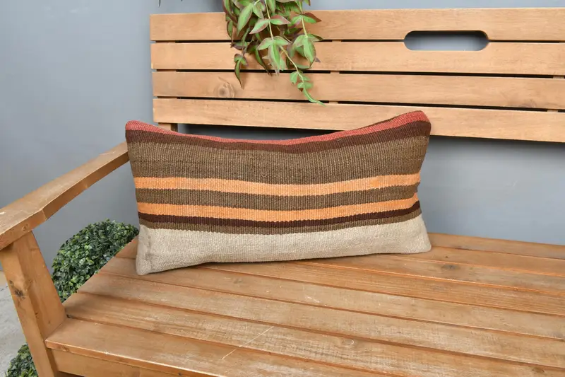 Beige & Brown Striped Pillow, 24x12 Embroidered Throw Pillow