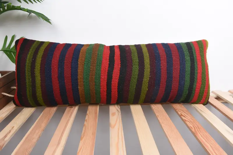 Handmade Green & Red Striped Pillow, Vintage Embroidered Throw Pillow