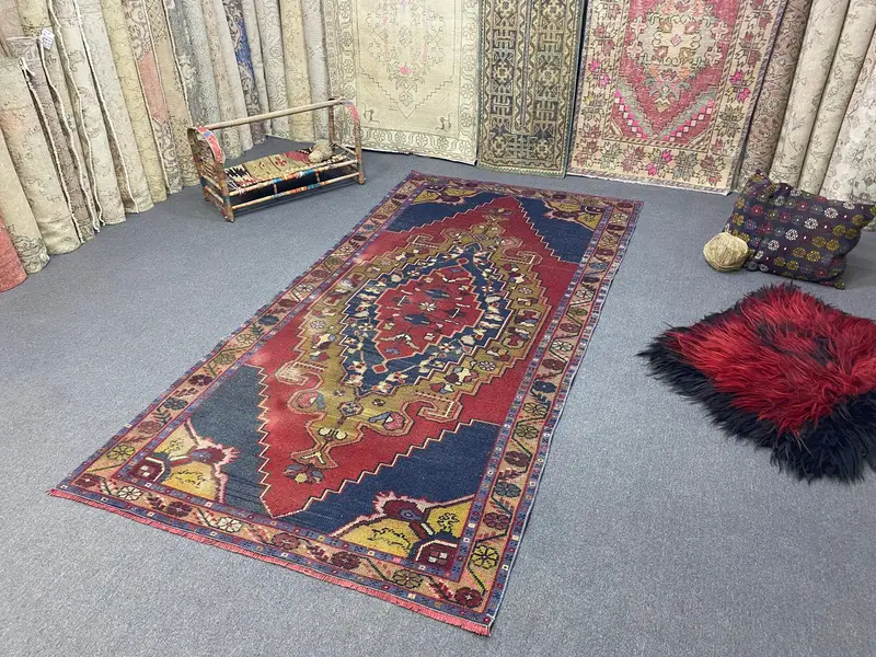 Blue Rainbow Rug, 4.2x8.5 ft Floral & Geometric Design