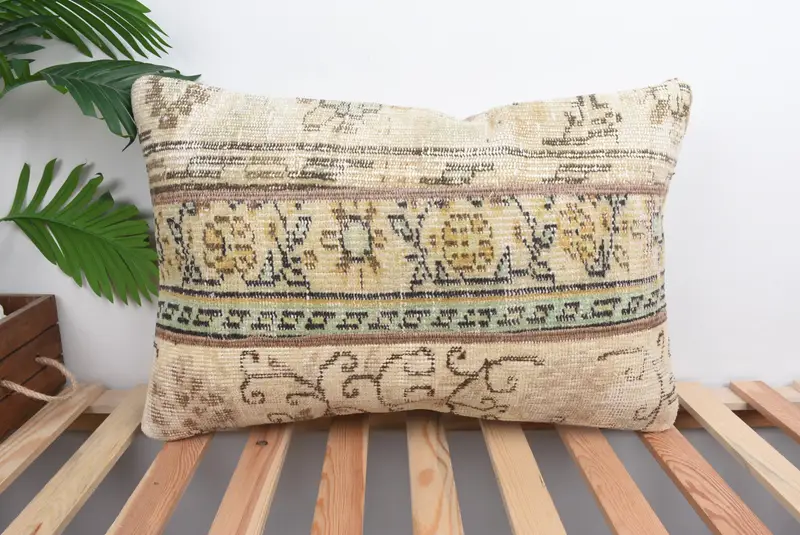 Beige & Green Patchwork Pillow, 16x24 Embroidered Throw Pillow