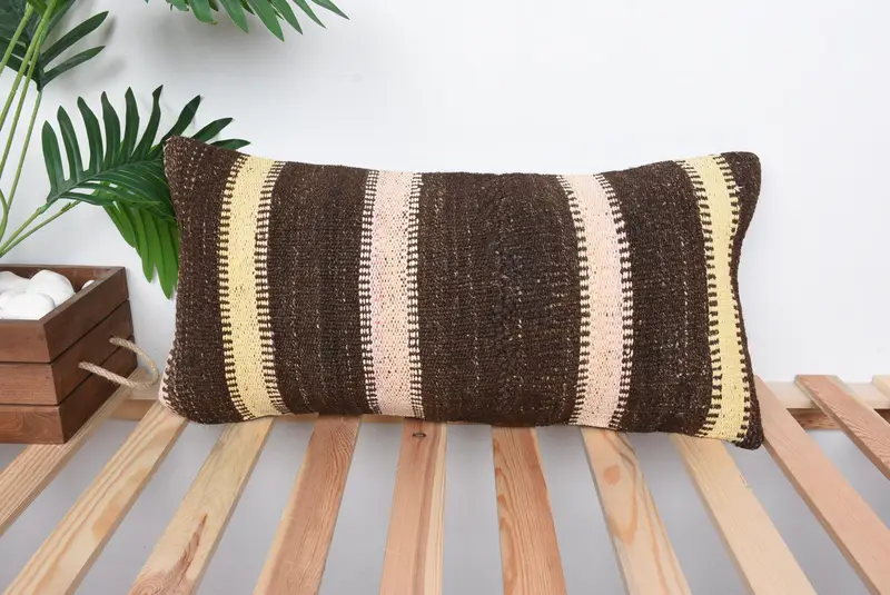 Beige & Brown Striped Pillow, Vintage Embroidered Throw Pillow