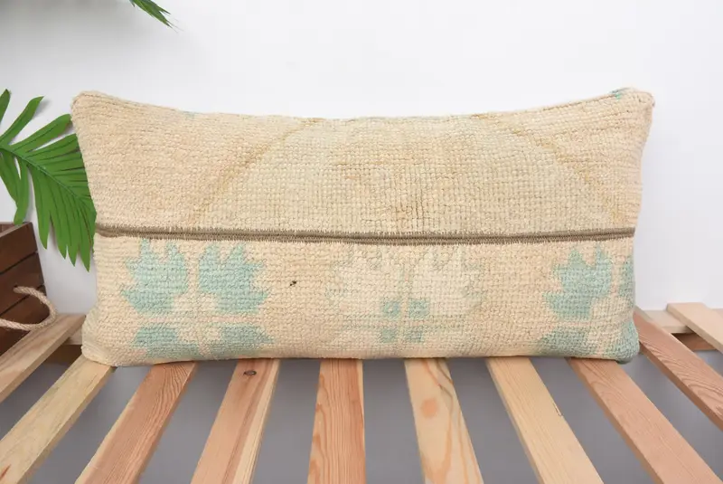 Handmade Beige & Green Patchwork Throw Pillow, Rectangular Vintage Pillow