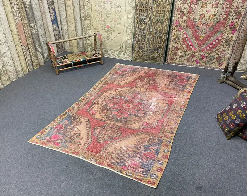 Red and Blue Rug, 4.2x7.2 ft Floral and Geometric