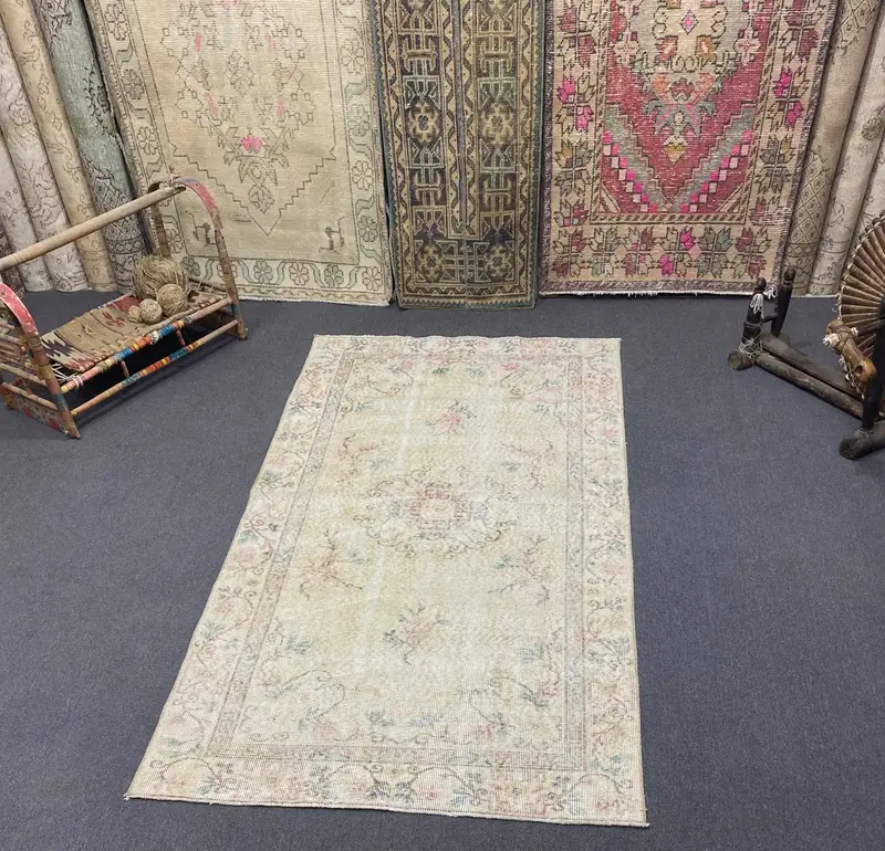 Elegant Beige & Blue Floral Rug, 3.6x7 ft Chic Decor