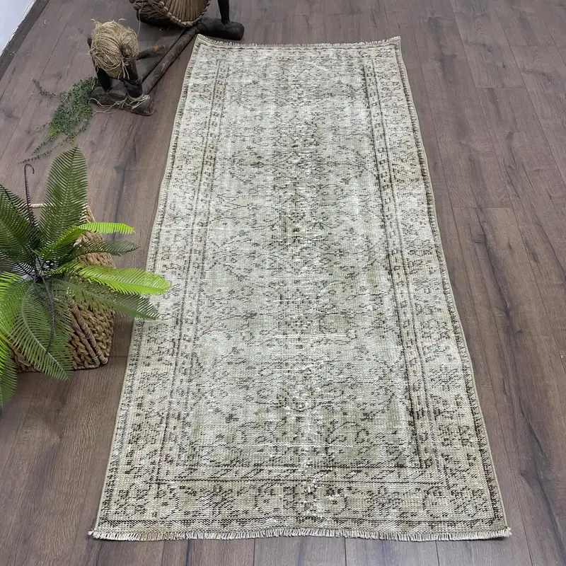 Green & Brown Rug, 2.9x6.4 ft Striped with Geometric Shapes
