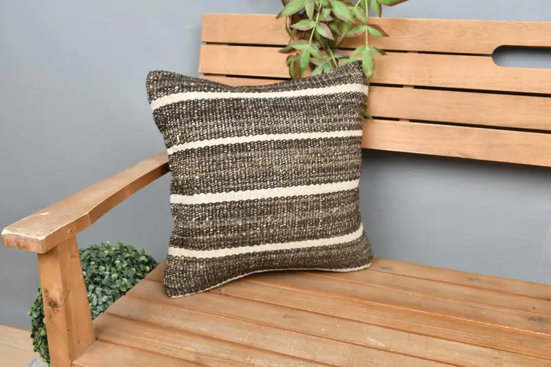 Brown & Beige Striped Throw Pillow, Embroidered Vintage Cushion