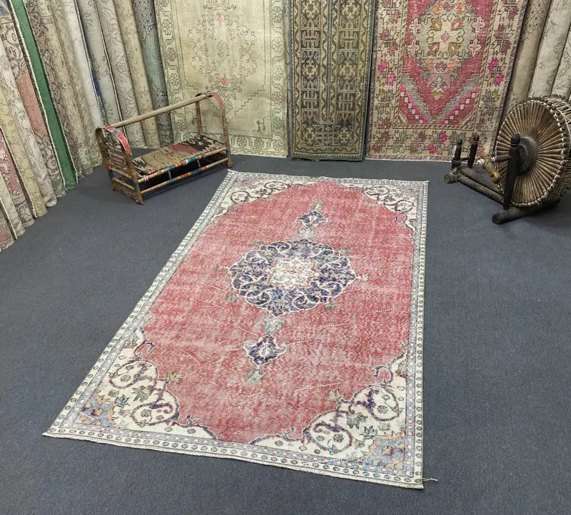Red and Blue Rug, 4,6x8,2 ft Floral and Geometric Design