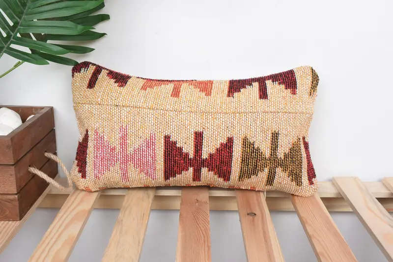 Geometric Beige & Red Embroidered Pillow, Versatile Rectangle Throw Pillow