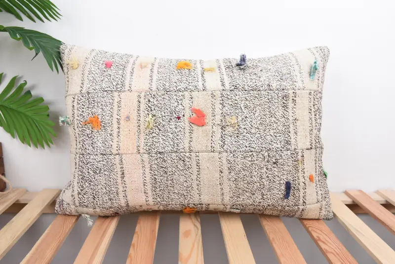 Beige & Brown Embroidered Patchwork Throw Pillow, Handmade Vintage Cushion