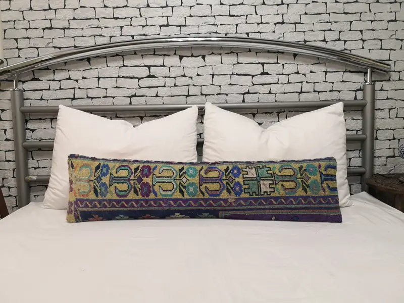 Handmade Blue & Green Geometric Wool Throw Pillow, Vintage Rectangle Pillow