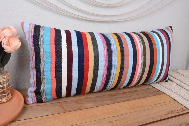 Blue & Black Striped Throw Pillow, 16x36 Embroidered Cushion