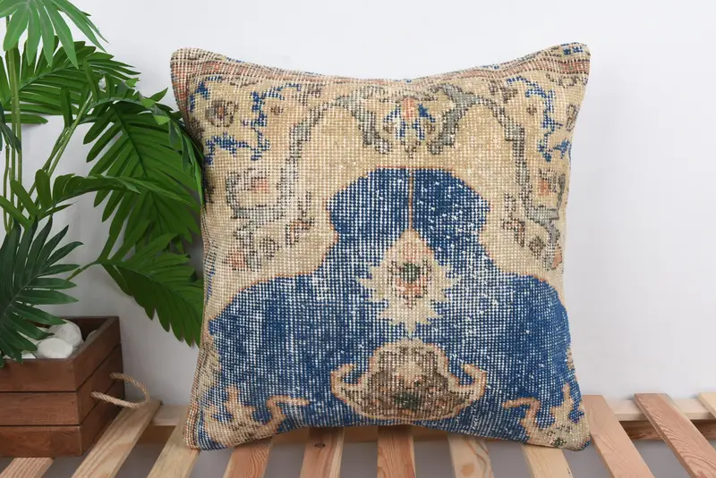 Embroidered Southwestern Throw Pillow, Blue & Orange Vintage Cushion