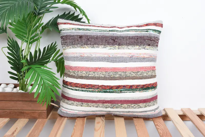 Handmade Linen Throw Pillow, Striped Vintage Cushion with Zipper Closure