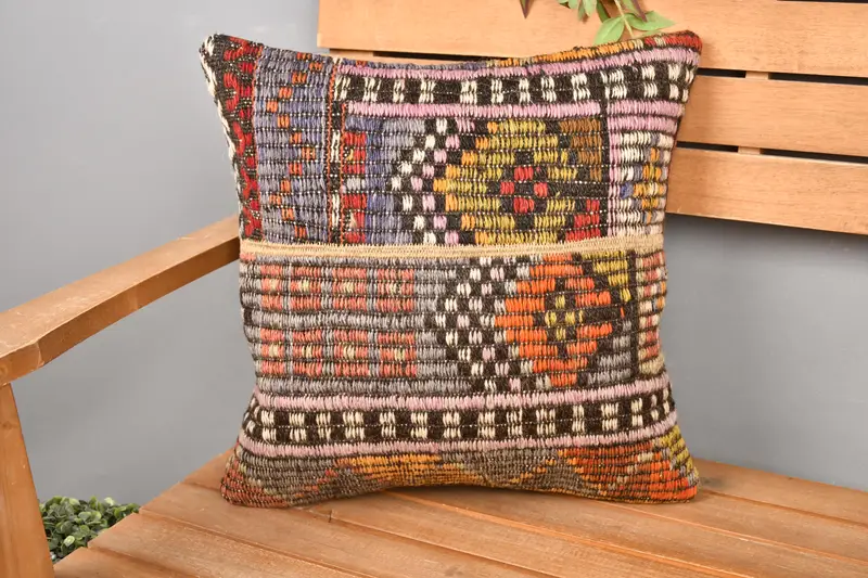 Orange and Purple Patchwork Throw Pillow, Embroidered Vintage Cushion