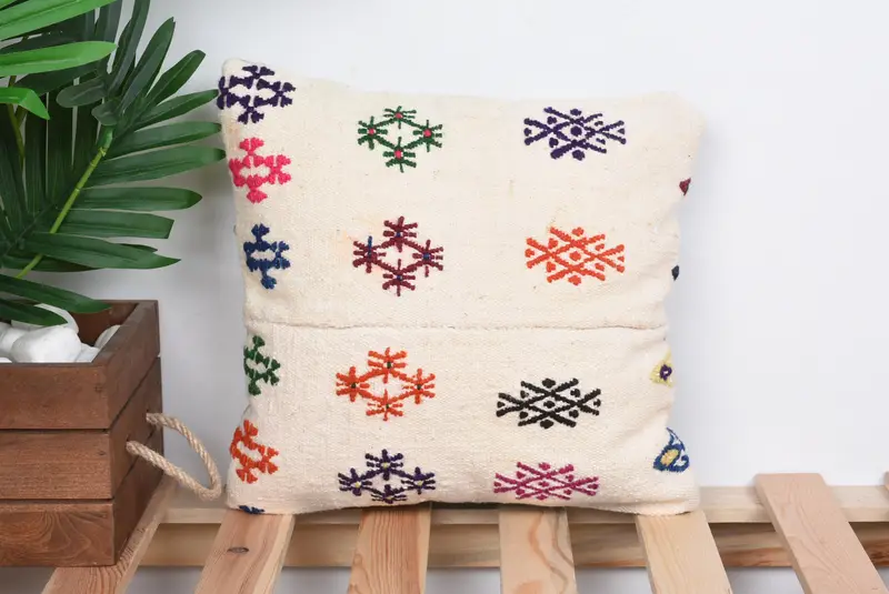 Embroidered Linen Throw Pillow, Vintage Geometric Cushion