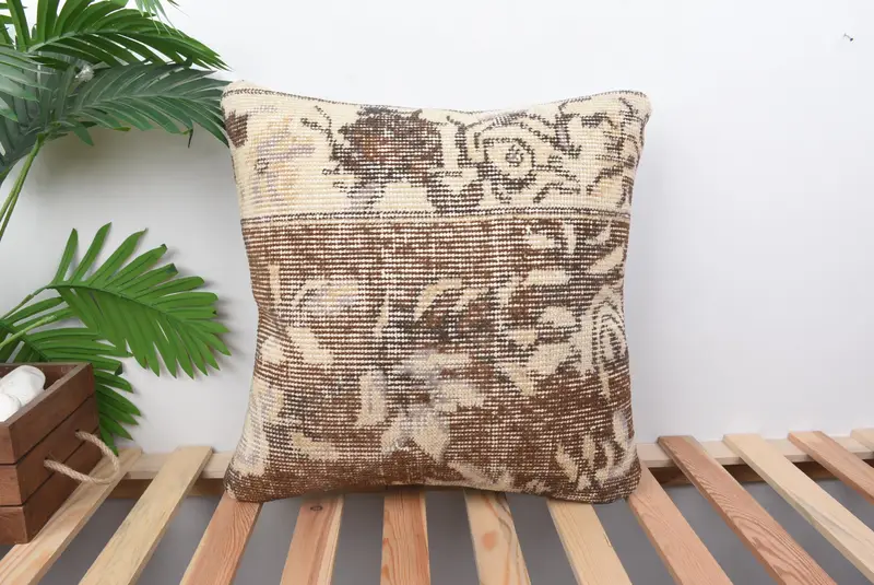 Brown & Beige Embroidered Throw Pillow, Vintage Floral Cushion