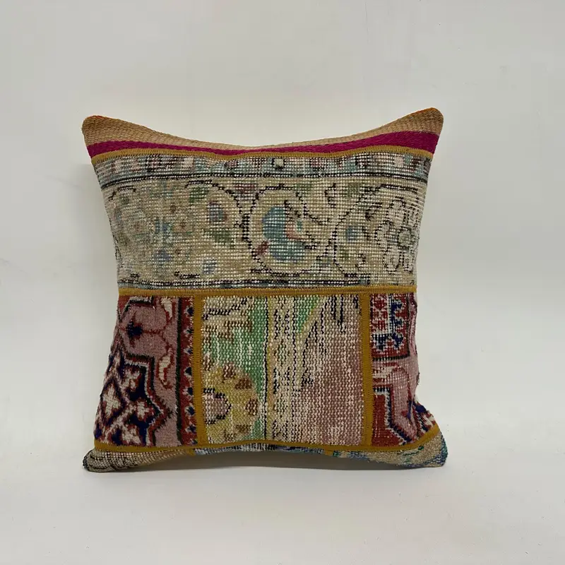 Beige & Green Patchwork Throw Pillow, Embroidered Vintage Cushion