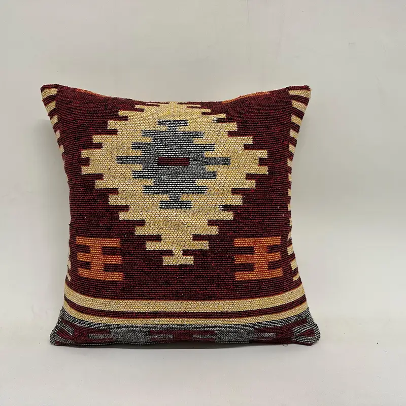 Red & Beige Embroidered Throw Pillow, Vintage Geometric Cushion