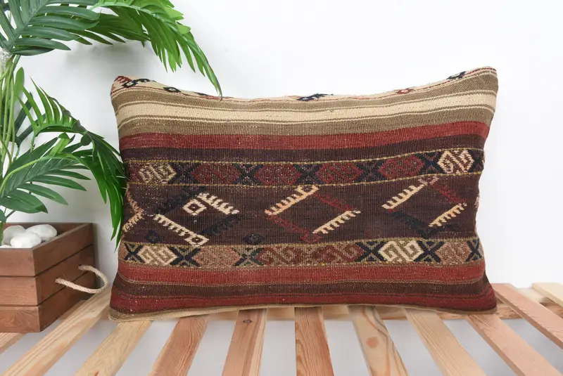 Handmade Brown & Red Striped Pillow, 16x24 Embroidered Throw Pillow