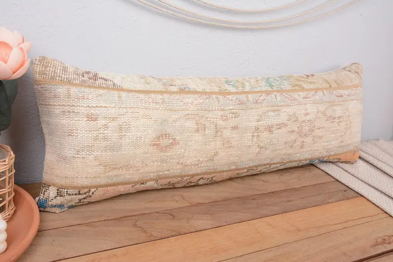 Handmade Beige & Green Patchwork Throw Pillow, 12x36 Vintage Cushion