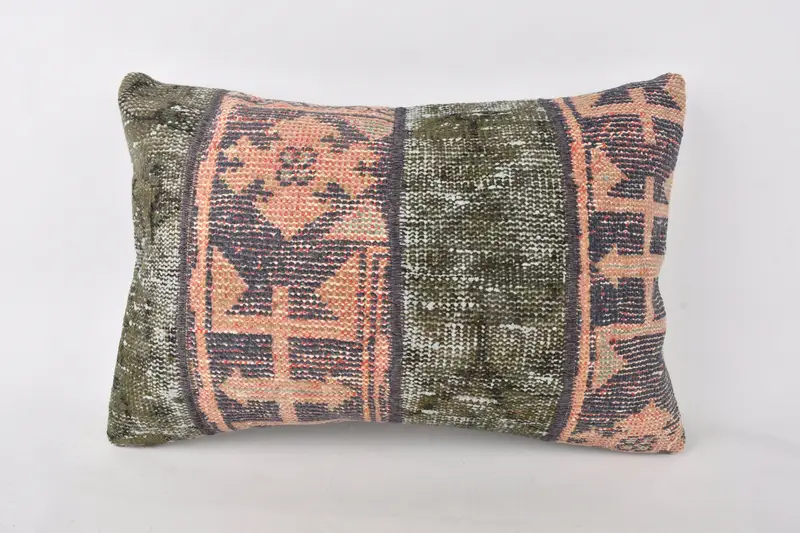 Green Linen Pillow with Bronze Patchwork, Vintage Rectangle Throw Pillow