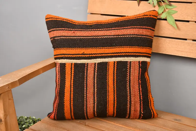 Orange & Brown Patchwork Throw Pillow, 16x16 Embroidered Vintage Pillow