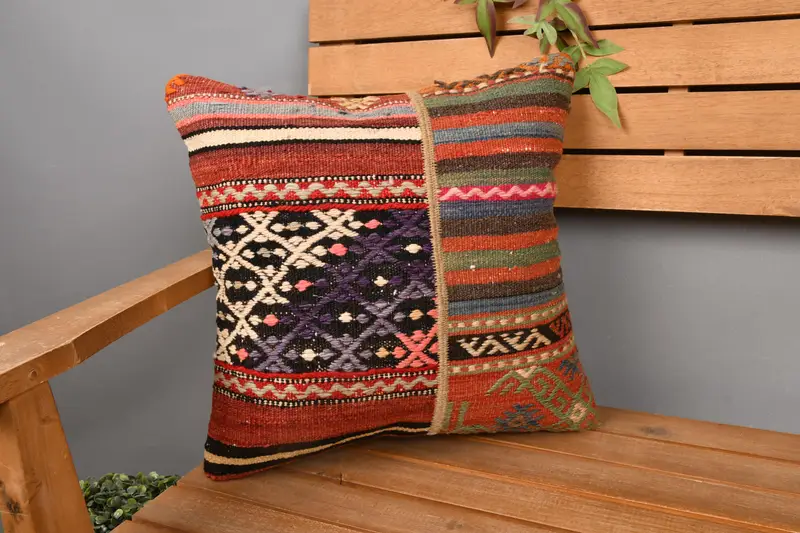 Red & Orange Patchwork Throw Pillow, Embroidered Vintage Pillow